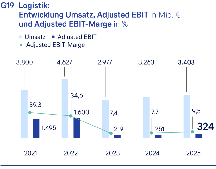 Im Geschäftsjahr 2025 konnten die Umsatzerlöse im Geschäftsfeld Logistik um 4 % auf 3.403 Mio. EUR gesteigert werden (Vorjahr: 3.263 Mio. EUR). Ausschlaggebend für den Anstieg war eine stabile Marktnachfrage und das weiterhin starke Geschäft aus Asien. Die operativen Erträge erhöhten sich insgesamt um 4 % auf 3.485 Mio. EUR (Vorjahr: 3.356 Mio. EUR).