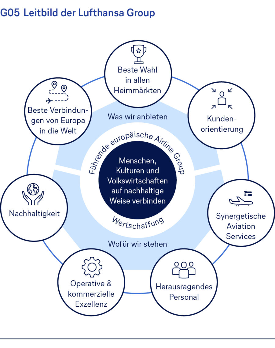 Die Konzernstrategie zielt auf eine strukturelle Transformation und Modernisierung der Lufthansa Group ab. Damit will die Lufthansa Group in einem sich verändernden geopolitischen Umfeld mit hoher Dynamik und spürbaren Auswirkungen auf die Nachfrage sowie auf Liefer- und Wertschöpfungsketten bestmöglich aufgestellt sein. Chancen, die sich aus Trends und Marktveränderungen ergeben, sollen konsequent genutzt werden. Dienstleistungen, Geschäftsmodelle und organisatorische Strukturen sollen kontinuierlich auf das komplexe und dynamische Marktumfeld ausgerichtet werden. Ziel ist es, die führende Marktposition und den wirtschaftlichen Erfolg der Lufthansa Group abzusichern. Dazu soll sich das Unternehmen zu einer agilen, flexiblen und noch wettbewerbsfähigeren Organisation weiterentwickeln. Insbesondere die stärkere Ausrichtung auf die Kundenbedürfnisse, die Beschleunigung von Innovation und Digitalisierung, verantwortungsbewusstes und nachhaltiges Handeln, moderne Formen der Arbeitsorganisation sowie eine wertorientierte Unternehmenssteuerung bilden die Grundlagen für eine zukunftsfähige Ausrichtung der Lufthansa Group.