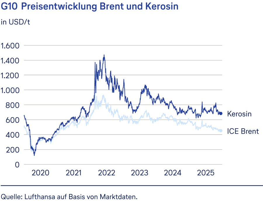 Der Jet Fuel Crack, die Preisdifferenz zwischen Rohöl und Kerosin, bewegte sich 2025 innerhalb einer Bandbreite von 13,49 USD/bbl und 40,15 USD/bbl. Im Jahresdurchschnitt notierte er bei 22,80 USD/bbl und damit um 12 % höher als im Vorjahr. Am 31. Dezember 2025 lag der Jet Fuel Crack bei 26,46 USD/bbl (Jahresende 2024: 16,19 USD/bbl).