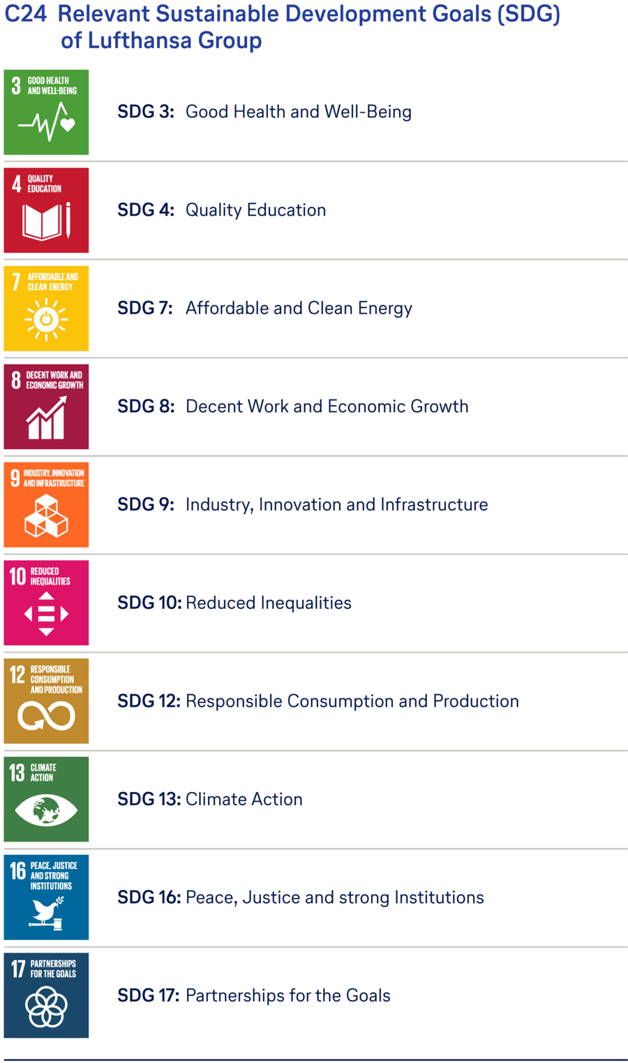 The Lufthansa Group has committed to the ten principles of the UN Global Compact for sustainable and responsible corporate governance since 2002, thus setting an example for long-term engagement, responsible corporate governance and sustainable development. The Company has also been committed to the implementation of the United Nations Agenda 2030 and its Sustainable Development Goals (SDGs) since 2015. As a contribution to achieving these goals, the Lufthansa Group concentrates on ten SDGs, where it can mitigate its negative impact or increase its positive impact. A detailed overview of the specific contributions to the SDGs can be found in the annex to the management report. ↗ T221 SDG Index.