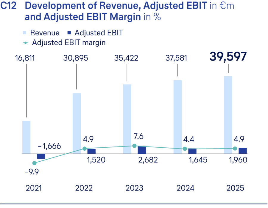 Based on EBIT, as a key performance indicator, Adjusted EBIT is adjusted for clearly defined, non-plannable earnings components for the purpose of better comparability. ↗ Financial strategy and value-based management.