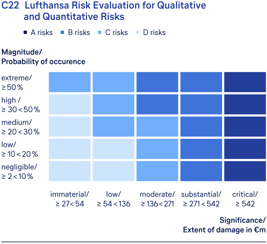 The individual qualitative and quantitative risks are divided into classes A, B, C, D and other risks to assess their materiality. In accordance with DRS 20, all quantitative A and B risks as well as all qualitative A and B risks that are at least of a “substantial” significance and a “high” magnitude count as material risks for the Lufthansa Group. ↗ C22 Lufthansa risk evaluation for qualitative and quantitative risks.