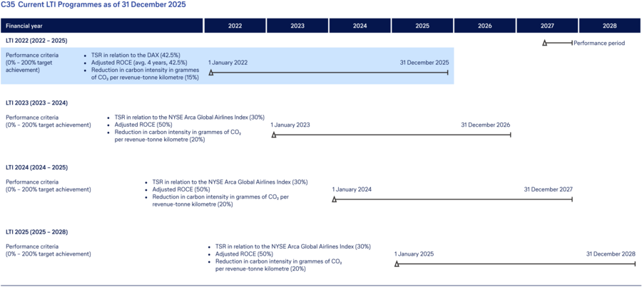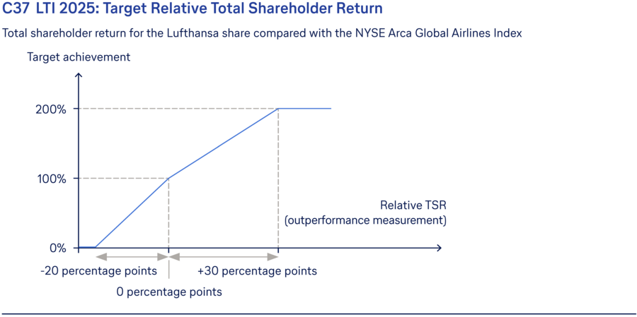 The Steering and Remuneration Committee and Supervisory Board assessed performance against the established targets at the end of the 2025 financial year. The individual and collective targets for the 2025 financial year established by the Supervisory Board relate to the implementation of the Lufthansa Group strategy, in particular the multi-brand, multi-hub and multi-AOC strategy, the improvement of the customer experience and advancement of digitalisation, the implementation of ESG measures, in particular the continued modernisation of the fleet, the development of the organisational structure to improve efficiency and the long-term increase in profitability and value creation.