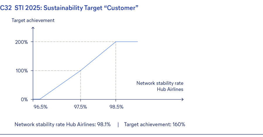 For the sustainability parameter “Customers”, the flight schedule stability rate of the hub airlines was used in the 2025 financial year. This measures the proportion of flights operated as planned, based on flight cancellations within 90 days prior to departure, by all Lufthansa Group hub airlines (Lufthansa Airlines, SWISS, Austrian Airlines, Brussels Airlines). Cancellations due to strikes or geopolitical events are excluded from this assessment in order to eliminate external effects. Interim figures are interpolated on a straight-line basis.
