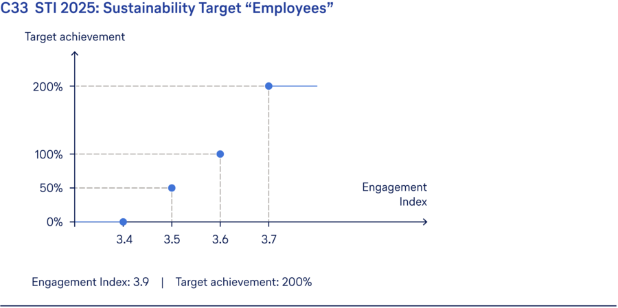 The Engagement Index is used for the parameter “Employees” (↗ Combined non-financial declaration). It measures the extent to which employees identify with the Company, as well as their commitment and willingness to recommend the Company to others as an employer. Each index score corresponds to a performance level. The 100% target is based on the average external benchmark. Following the change in the data collection scale during the financial year, “5” is now the best achievable score.