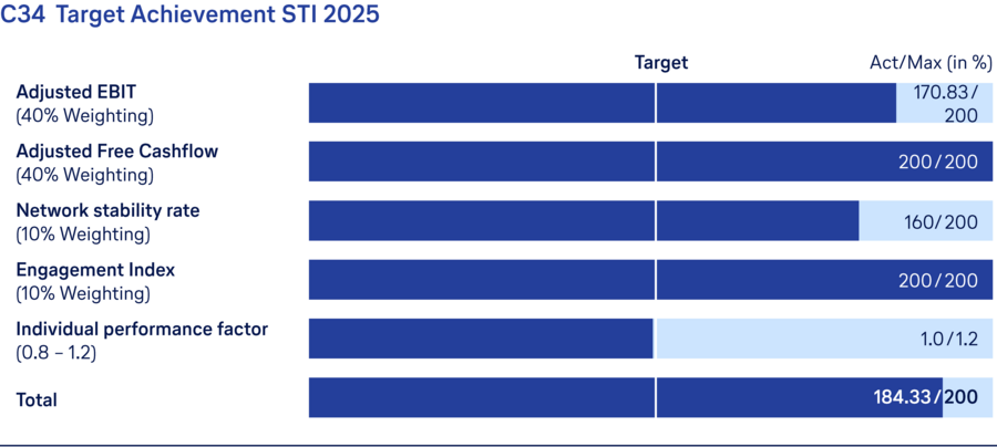 Overall, the level of target achievement for the STI 2025 based on the weighted target achievement of the financial and sustainability targets is thus 184.33%.
